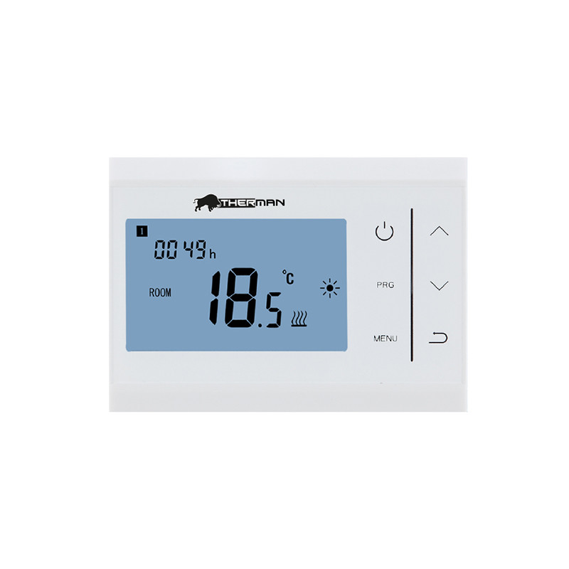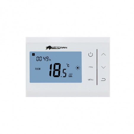 Alimentation thermostat 2 piles AAA 1,5 V (alcalines) Mémoire de sauvegarde EEPROM Charge maximale 0,5 A (charge ohmique) Programmation 7 jours, 4 périodes par jour. Plage de réglage 5 °C à 35 °C (pas de 0,5 °C) Contacts de sortie NO et NC (normalement ouvert / normalement fermé). Précision ± 0,5 °C Dimensions thermostat 135 mm × 88 mm × 22 mm. Indice de protection IP20 Certification CE,ROHS