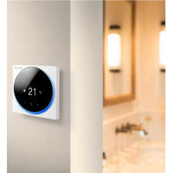 Caisson Couleur W Blanc (RAL 9003 brillant) Caisson Couleur S Gris (RAL 9006 argenté) Caisson Couleur K Noir (RAL 9005 mat) Fonctionnement LED Indicateur d'état Bleu Dimensions Unité (H x L x P) 85 x 85 x 25 mm Poids Unité 0,110 kg LCD Rétro-éclairage Blanc Unités raccordables Max unités intérieures Jusqu’à 16 unités par groupe Raccords de câblage Connexion Raccordement câblé P1-P2 depuis l’unité intérieure Raccords de câblage Taille câble 0,75 – 1,25 mm² Température extérieure Fonctionnement -10 à +50 °C Humidité relative Fonctionnement < 95 % Température extérieure Stockage -20 à +70 °C Sauvegarde en cas de panne Autonomie horloge Jusqu’à 48 h Technologie sans fil Bluetooth Bluetooth Low Energy 4.2 ou supérieur Application Réglages avancés Assistant Madoka Application Systèmes d’exploitation iOS 8.0+ / Android 5.0+